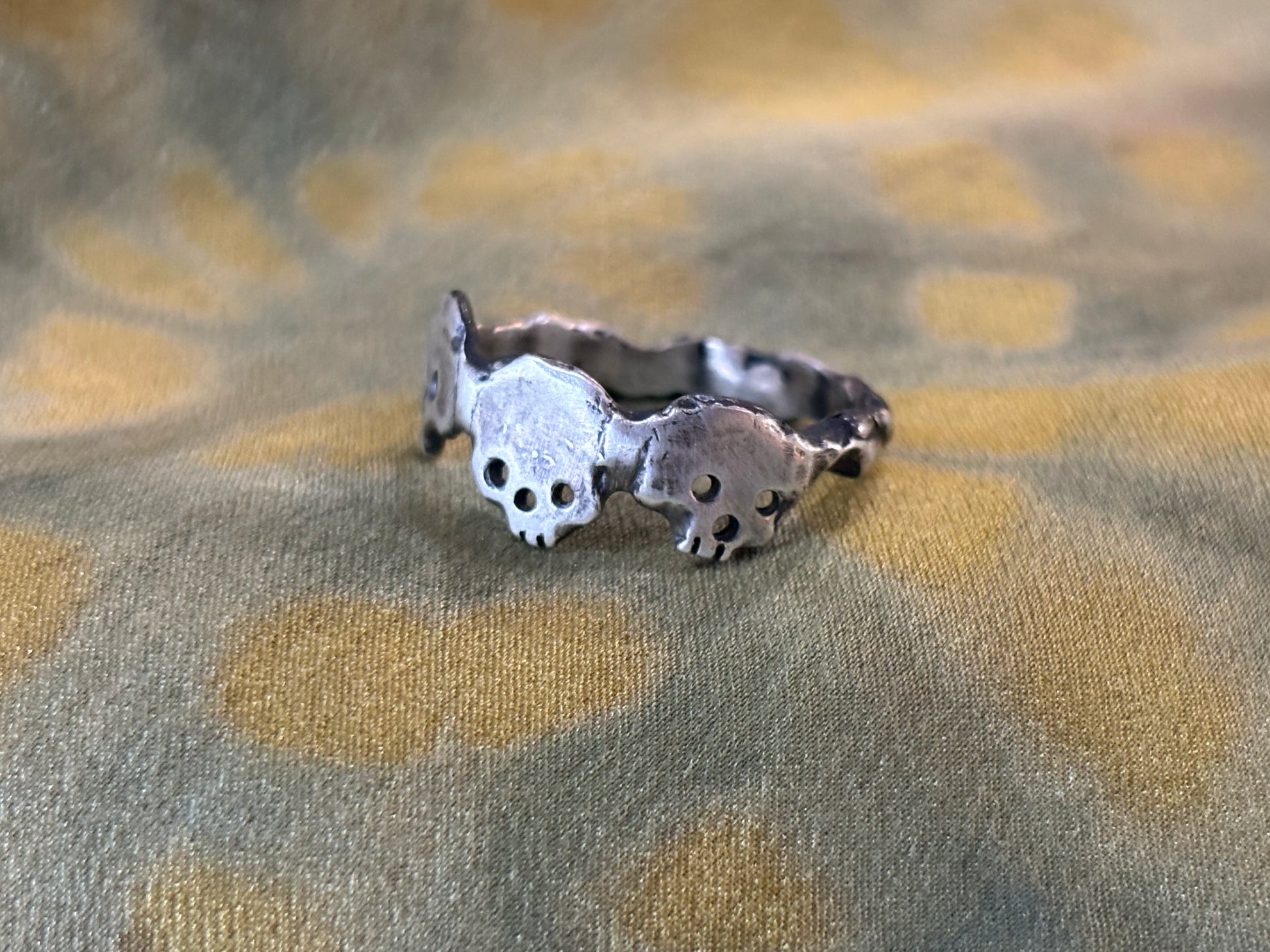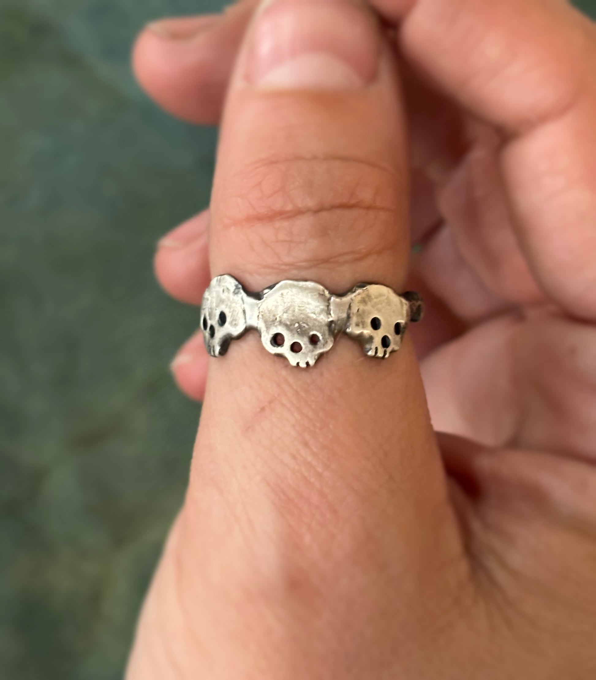 Embrace your dark and daring side with this stunning handmade silver skull trio ring! This unique ring features three tiny skulls, symbolizing strength, mystery, and individuality. Perfect for lovers of gothic style, rock fashion, or anyone looking to make a bold statement.