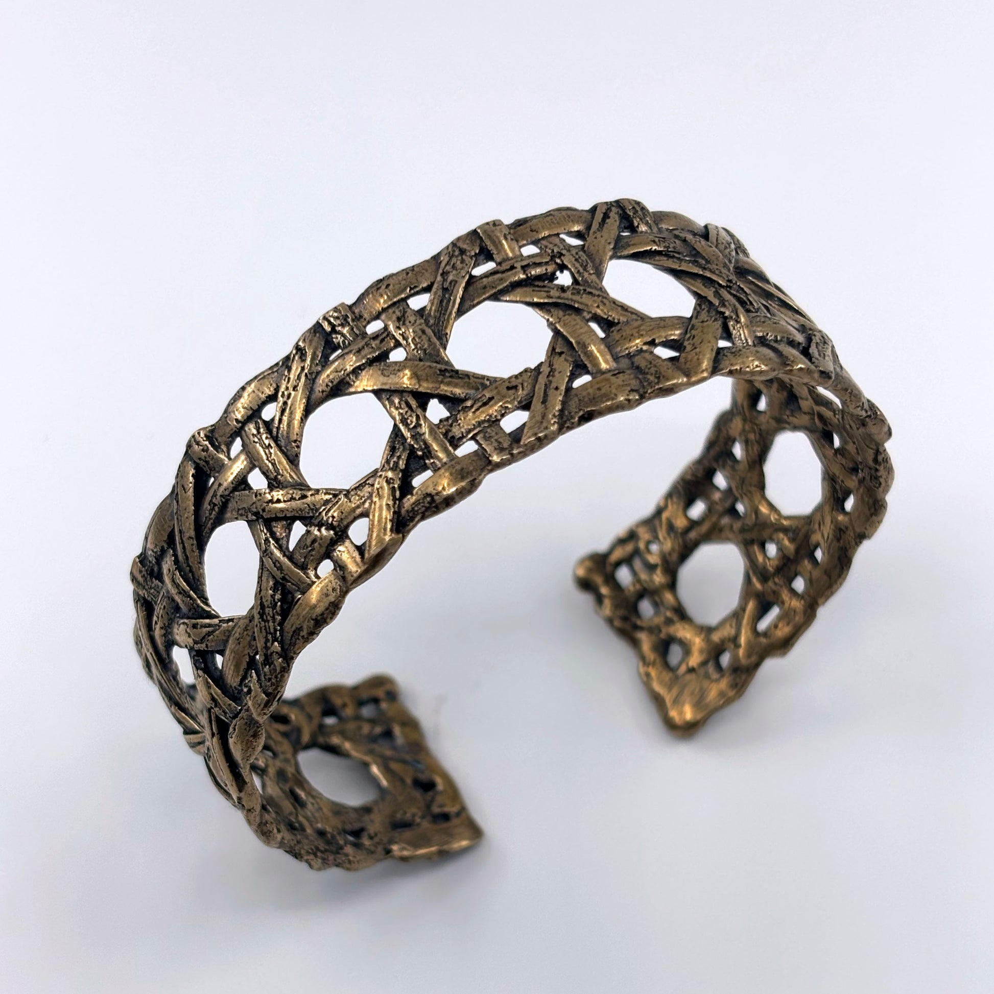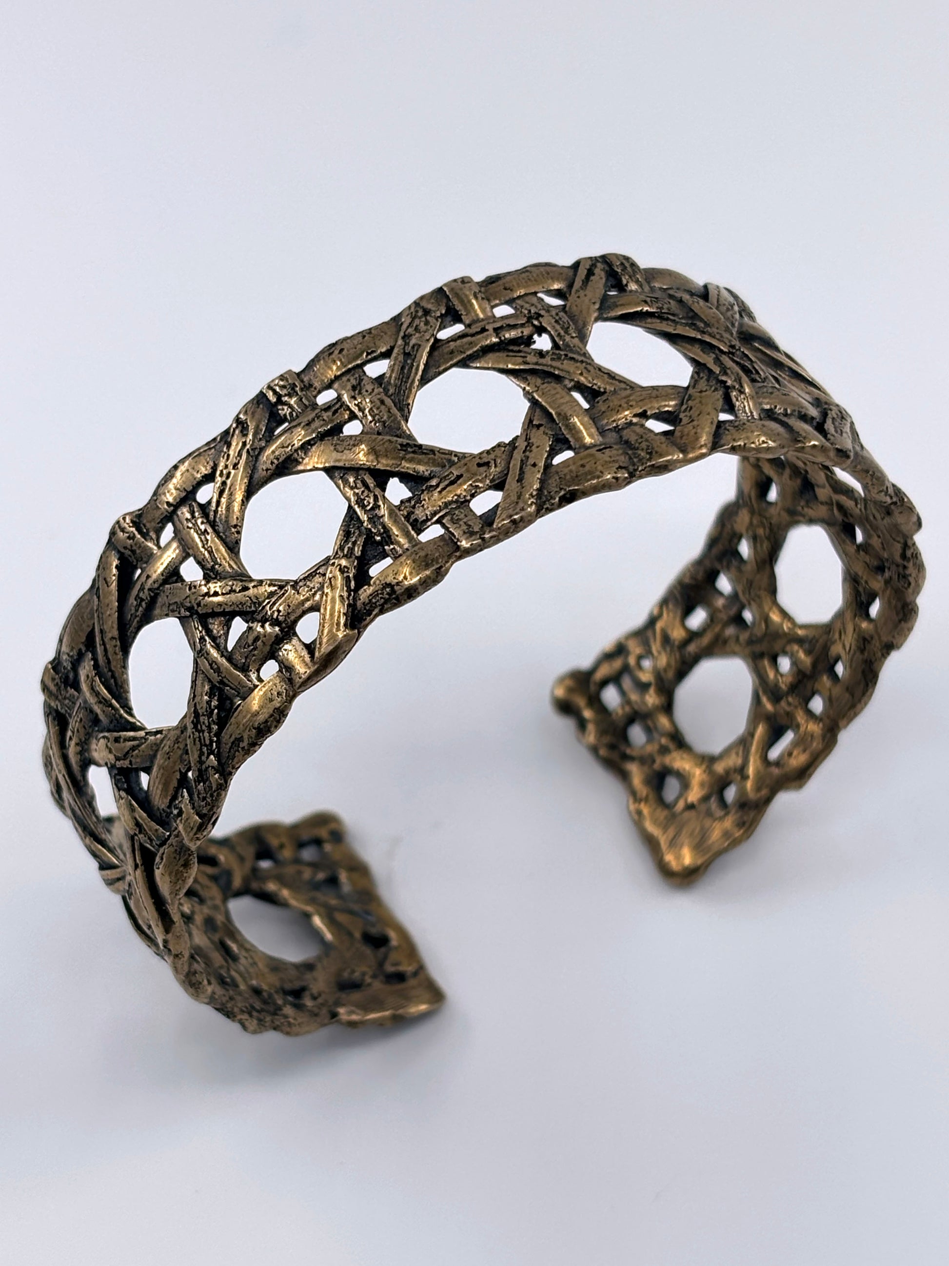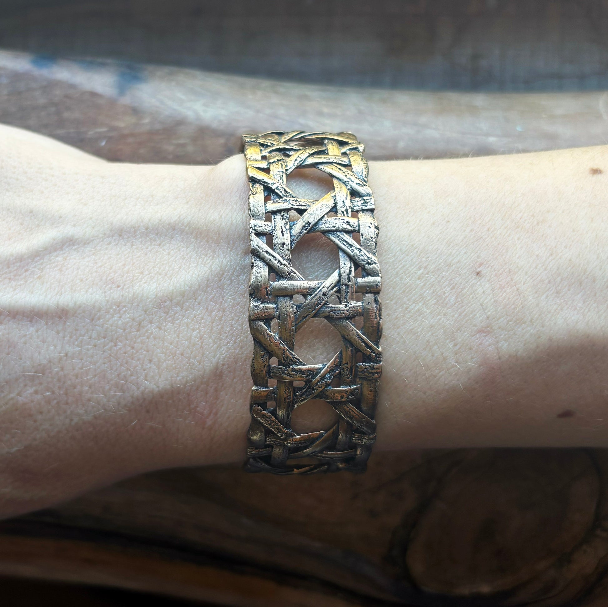Inspired by the timeless elegance of vintage cane furniture, the bronze Wickerwork cuff features an open lattice design cast in bronze. Its sculptural form blends organic texture with architectural structure, making it a bold yet lightweight statement piece.